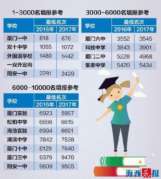 多年指导中招志愿填报的厦门金尚中学副校长王有光给出了一个“全市排名填报参考”,其中包括各校2016年和2017年全市最低位次,分享给考生们以供志愿填报(详见下表)。